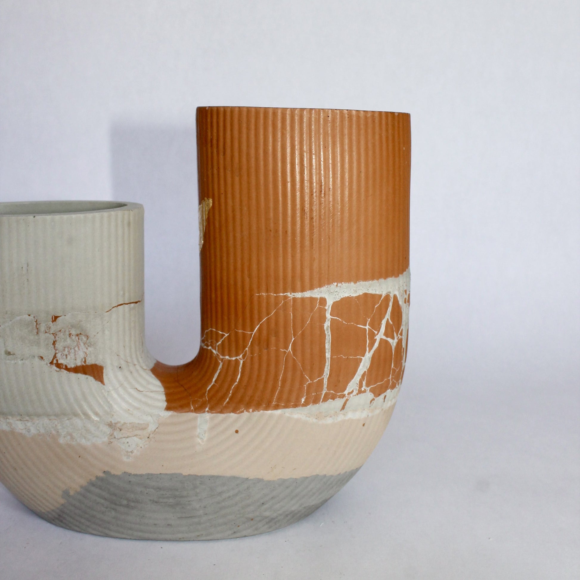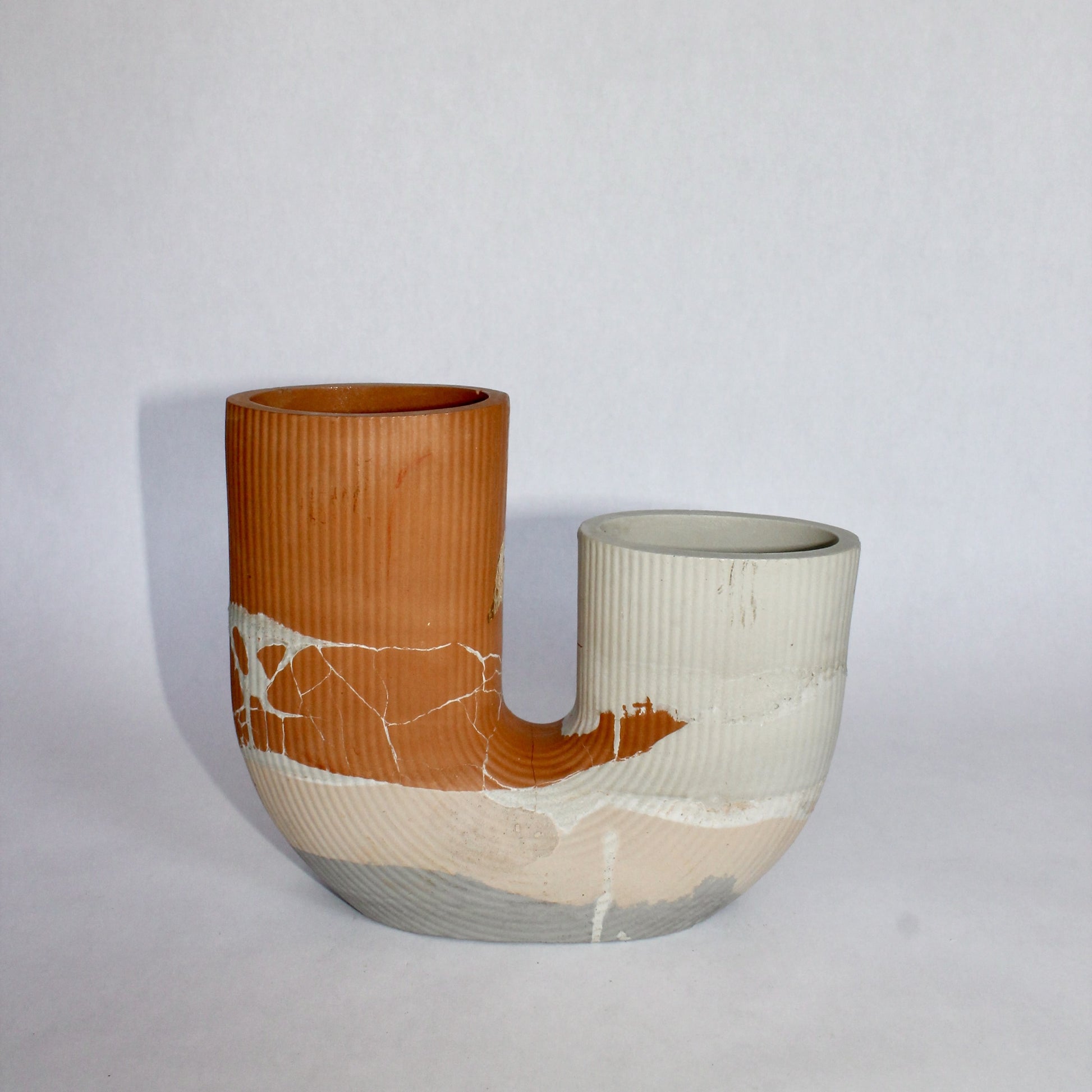Grounded yet refined, Costa Vase 016 features a soothing blend of light and medium gray, terracotta, and sandy beige—capturing the organic tones of sunbaked landscapes.