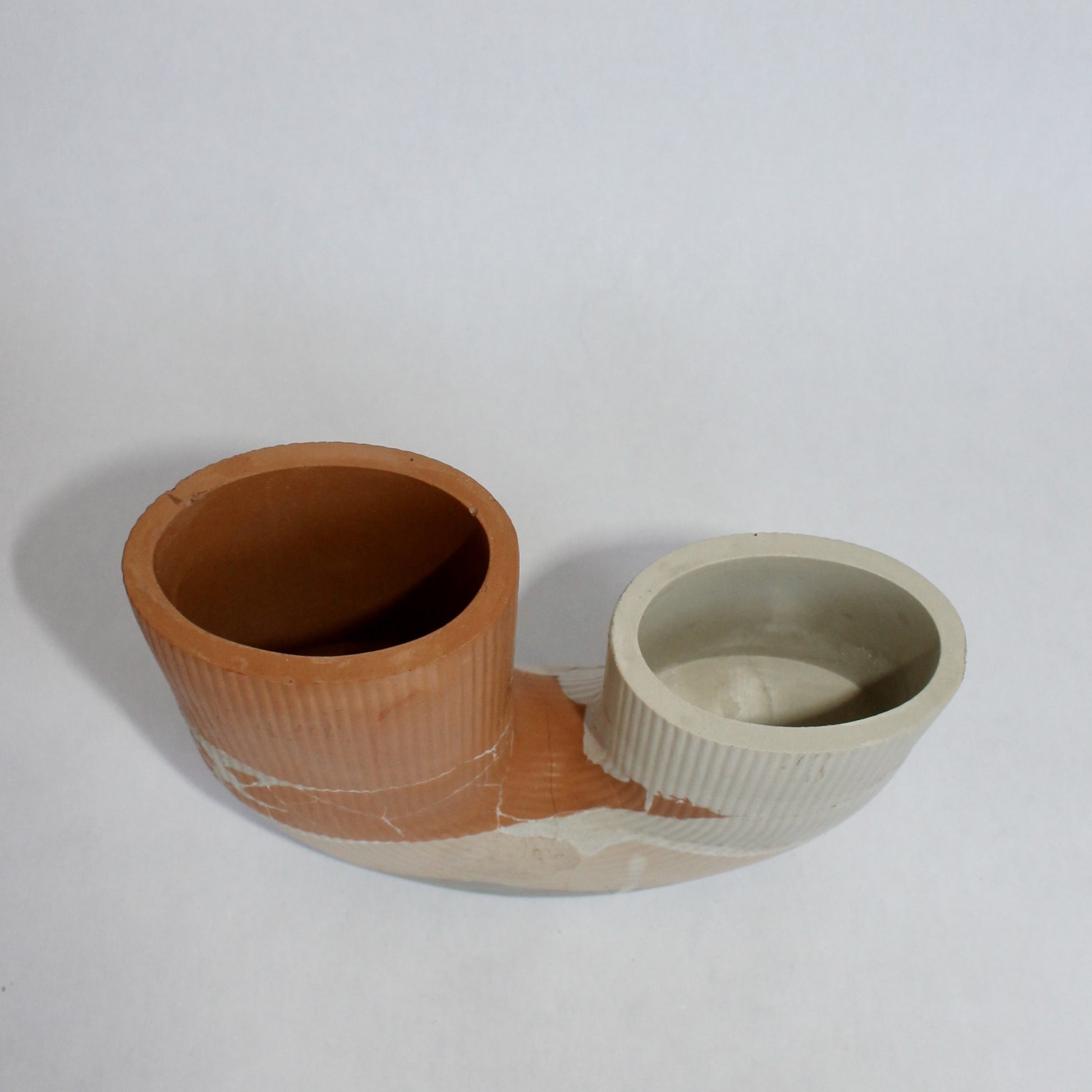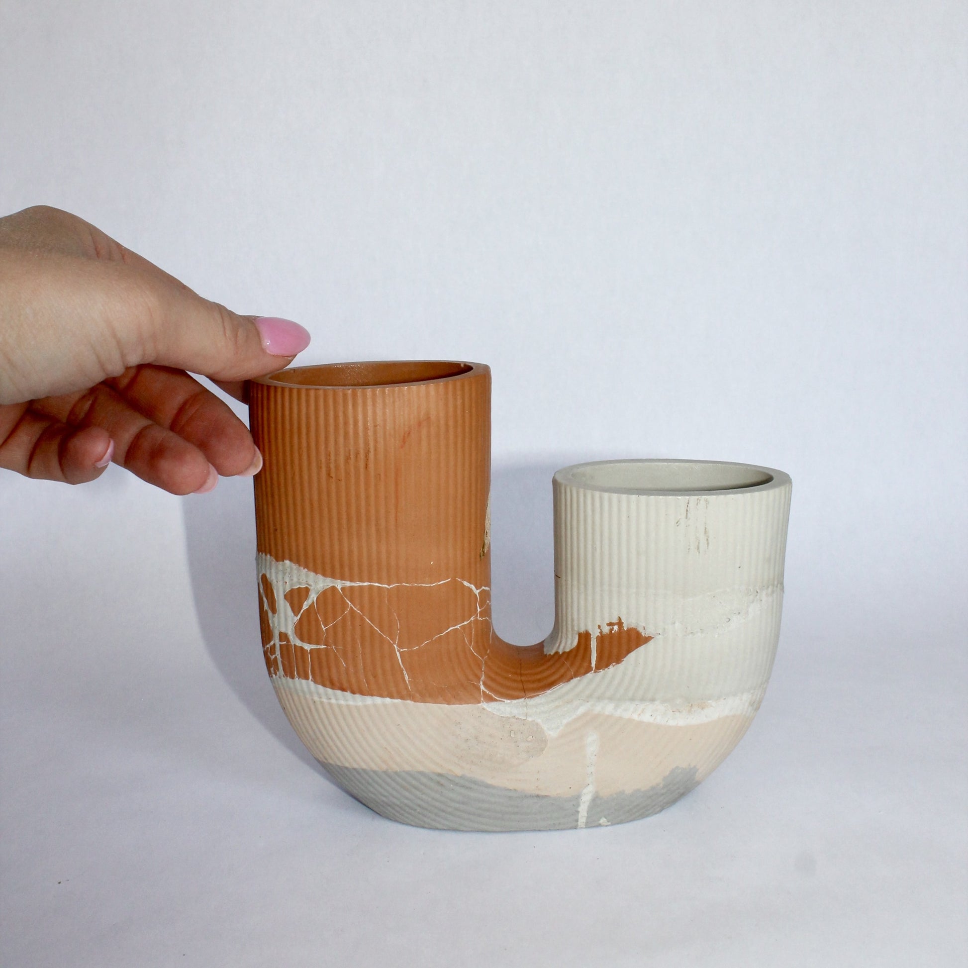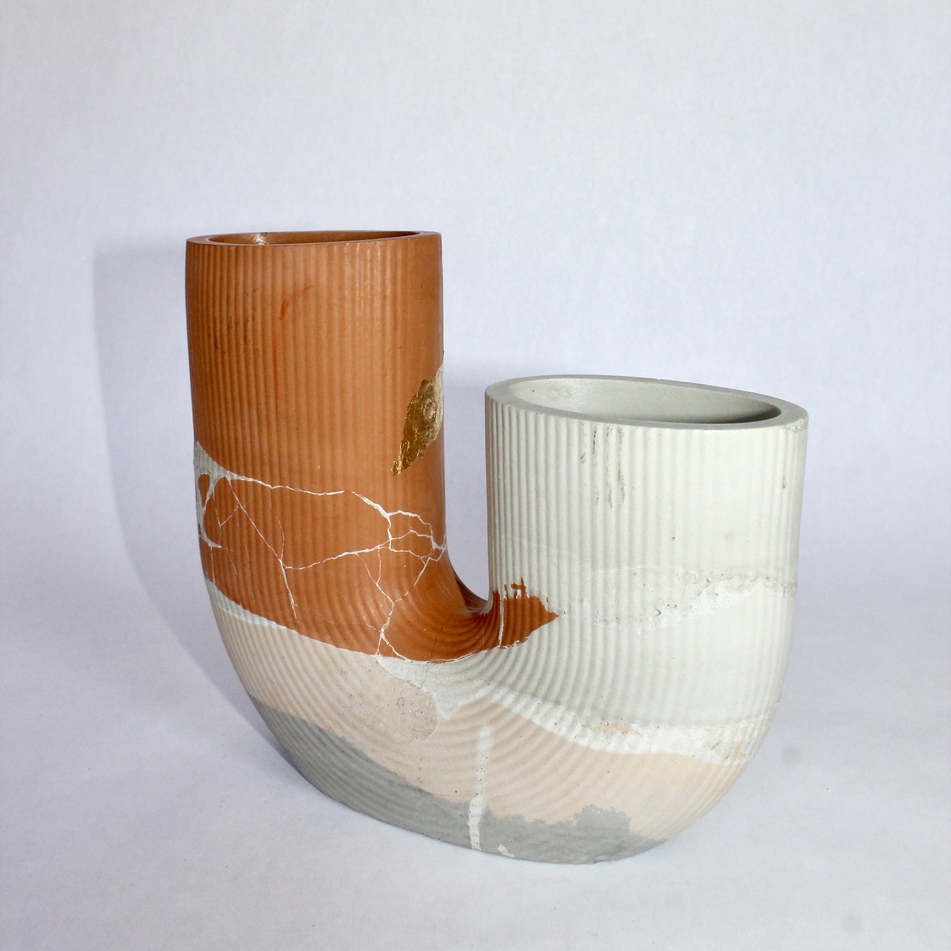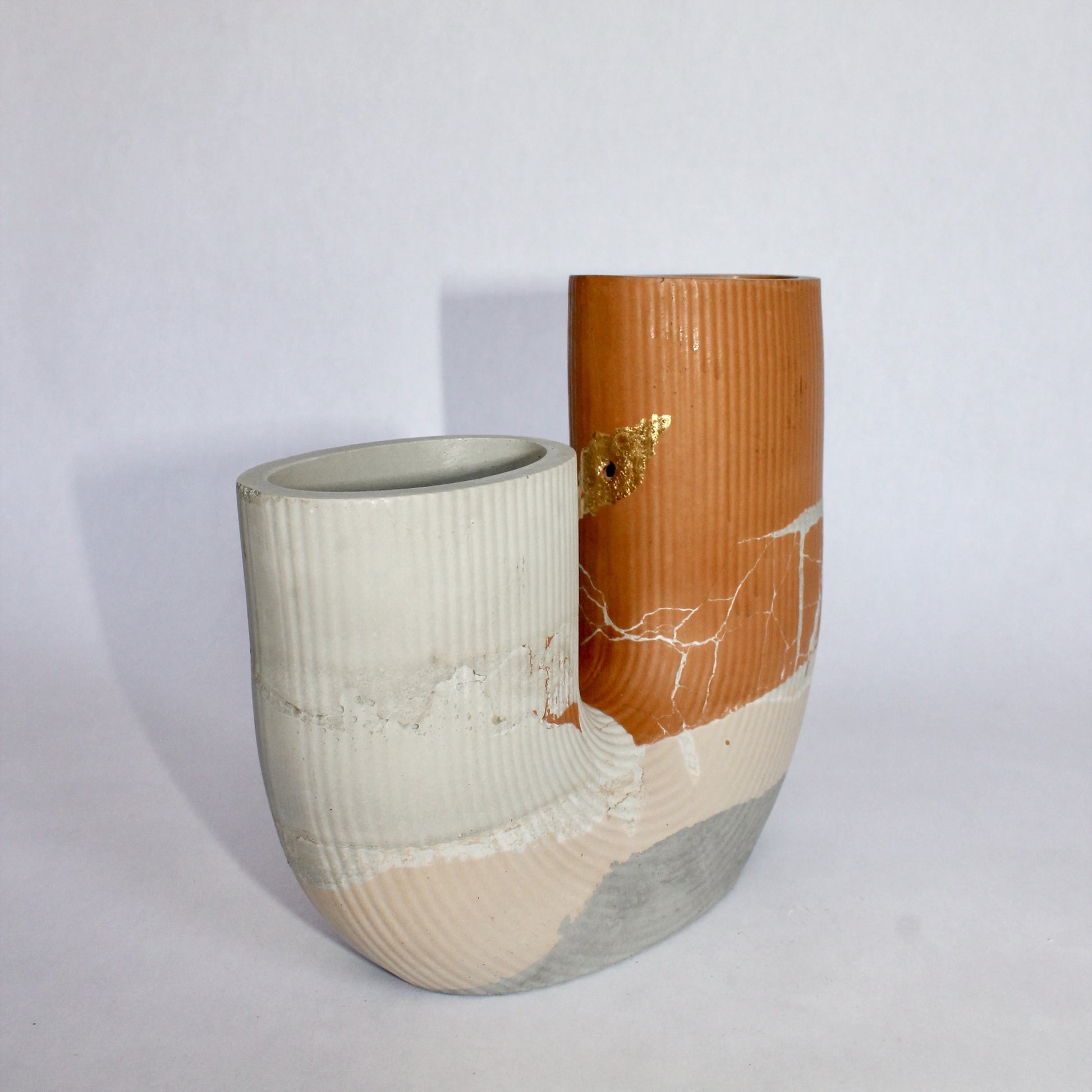 Its taller tower includes a small, sculptural hole delicately lined in gold leaf, adding a subtle pop of shine. While this opening isn't going to hold water, it offers the perfect spot for air plants, makeup brushes, or desk essentials. The second compartment is fully functional for water and fresh blooms, making this piece as practical as it is artful.