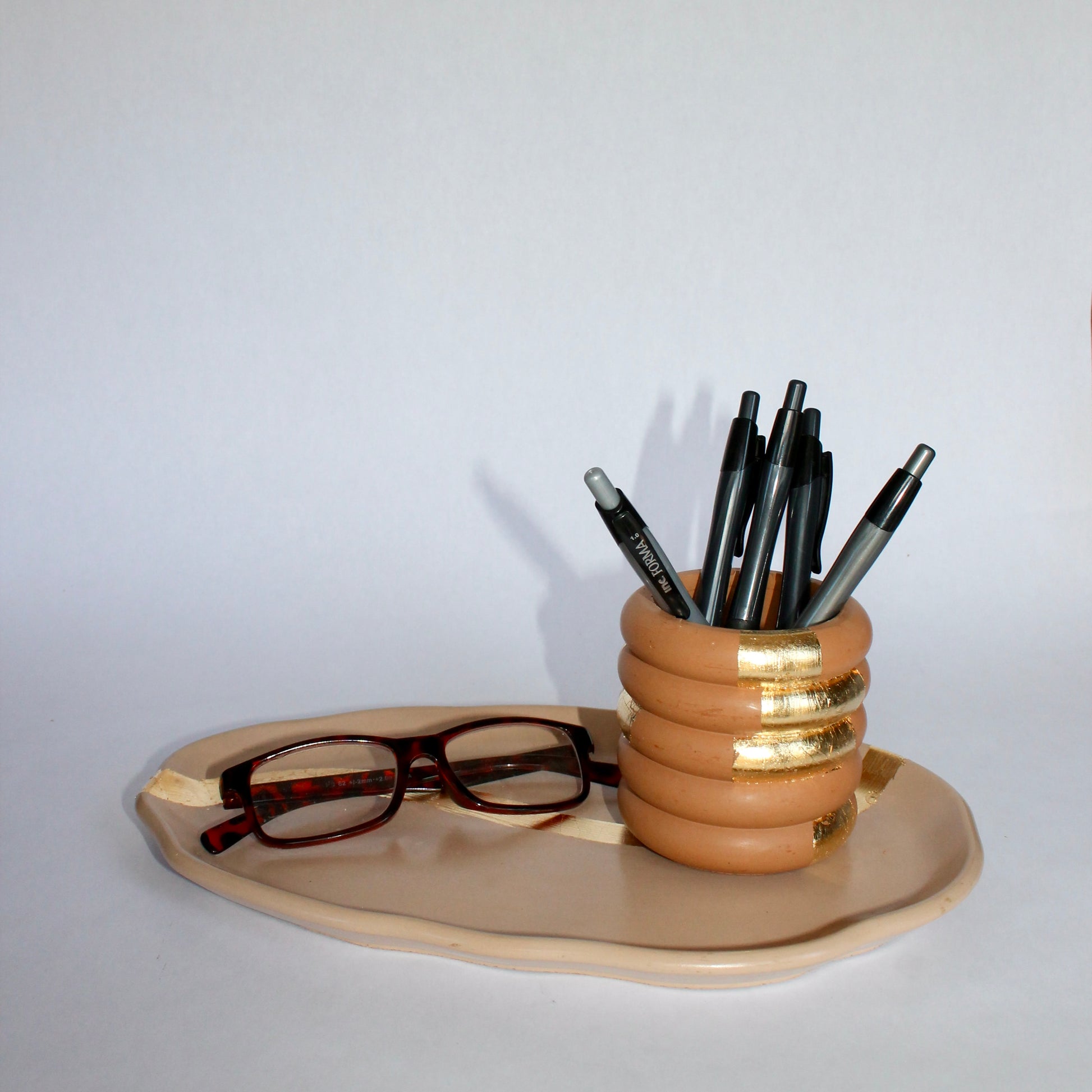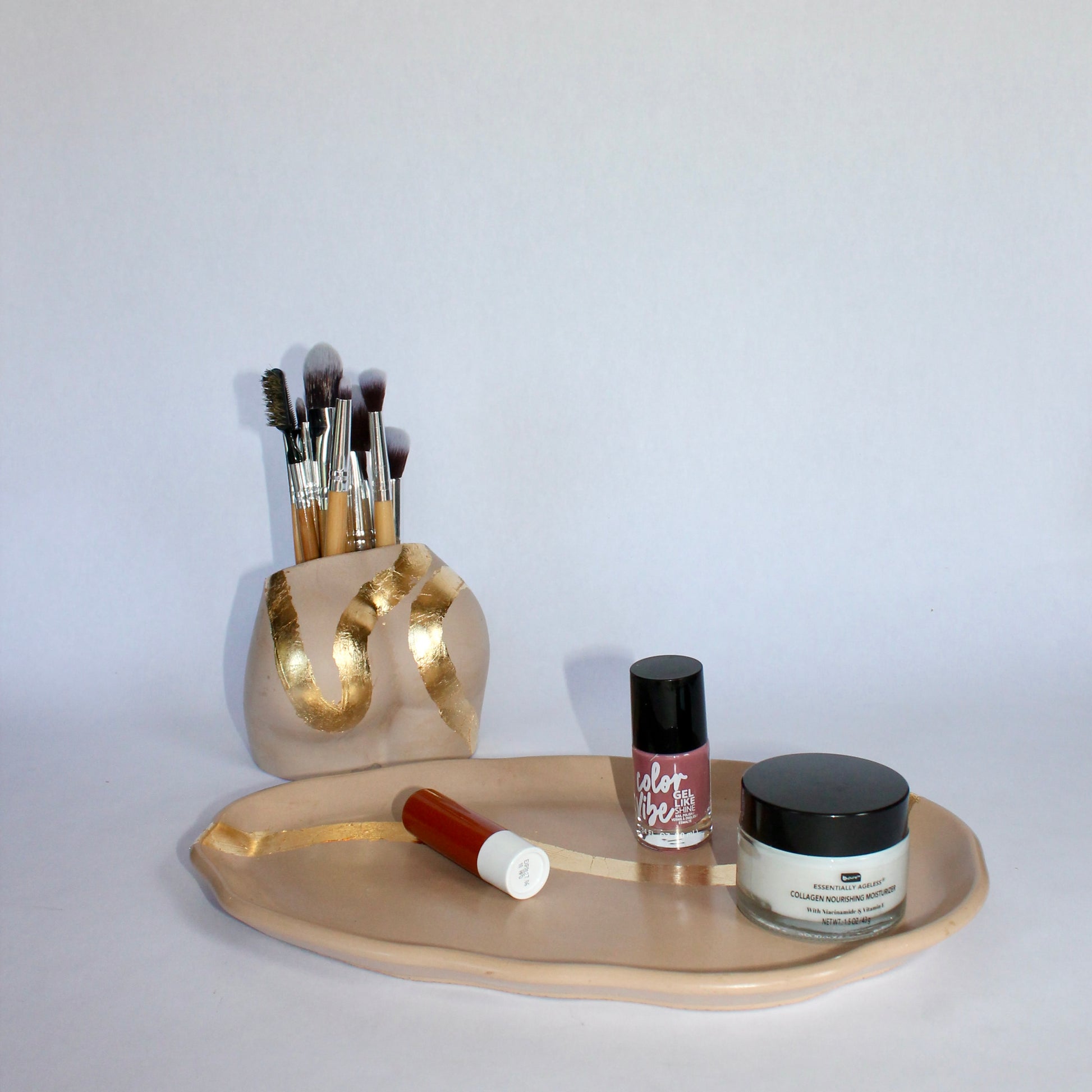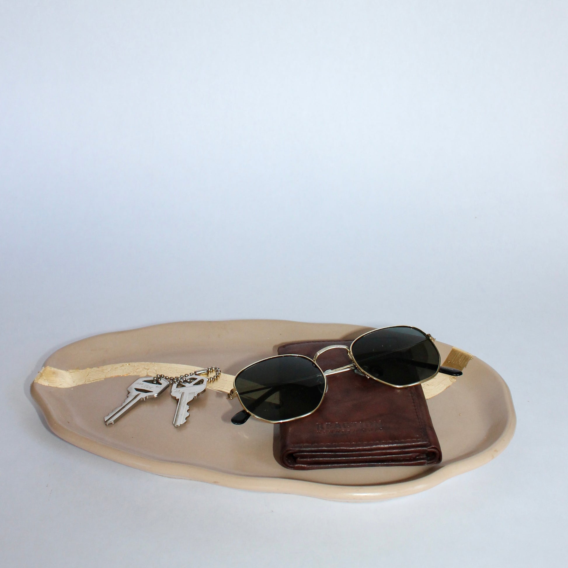 Oyster Tray 002 is part of the Perfectly Imperfect 003 collection—a celebration of beauty in flaws and a commitment to sustainability. Cast in a calming sandy beige concrete, this organically oval-shaped tray features a single gold-leaf ribbon across its surface, marking and elevating a cosmetic imperfection in the spirit of kintsugi.